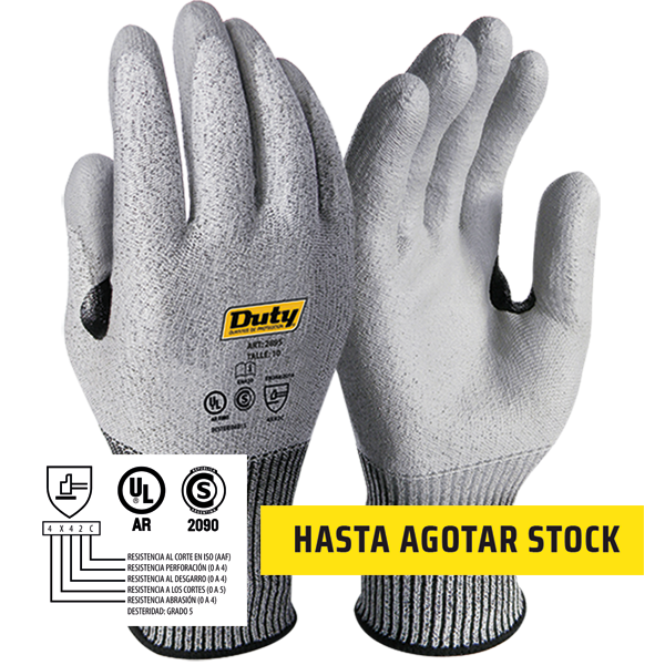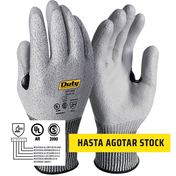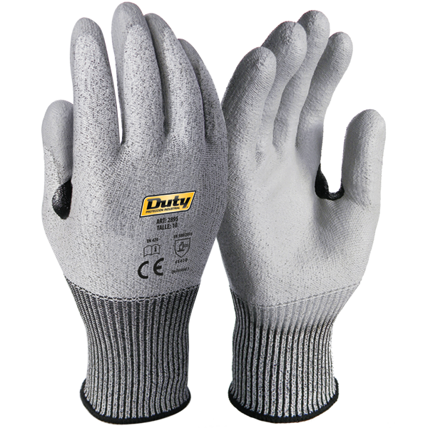 El guante DUTY® de máxima resistencia al corte (Nivel 5) sin costuras con baño de poliuretano (PU) utiliza una mezcla de fibras de alta prestación al corte, siendo extremadamente flexible donde se requiera precisión y movimiento, su fino baño de PU permite trabajos con piezas pequeñas y filosas y a la vez levemente humedecidas en grasas/aceites como así también en seco. Para una mayor durabilidad del guante, el mismo posee un refuerzo en nitrilo suave entre el índice y el pulgar.